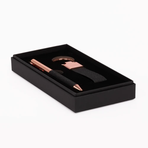 Set de Regalo"MINE", incluye llavero metálico encobrizado con lanyard de tela Oxford negro jaspeado + Bolígrafo metálico encobrizado con tela Oxford negro jaspeado, escritura negra . Presentación en elegante caja de carton color negro con tapa, interior cuna de EVA aterciopelada negra. Sobre funda de papel negro.