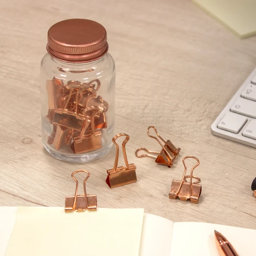 Ø 4,5 x 8,5 cm. Vidrio y metal. Set de sujeta papeles metálicos en frasco de vidrio con tapa metálica.