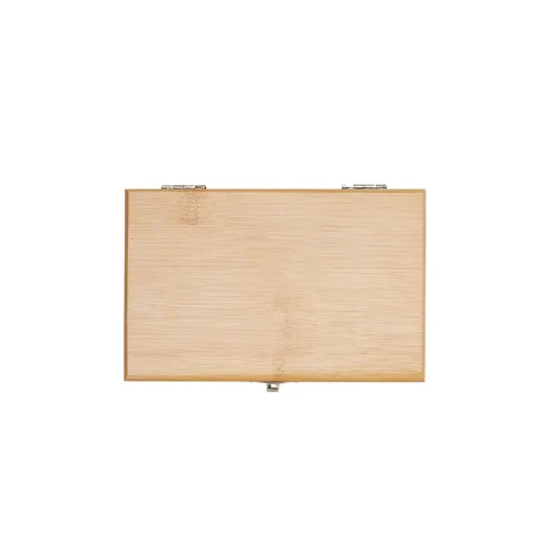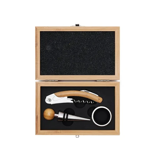 Set de vinos en estuche de bamboo. Contiene sacacorchos dos tiempos con navaja y destapador corona, tapón y collar cortagota. Medidas de la caja: 16 x 10 x 5 cm. La Baule.