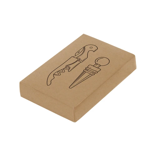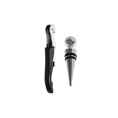 13 x 10 x 2,5 cm. Metal. Accesorios para vinos. Sacacorcho y tapón de metal. Estuche de cartón. Presentación en caja de regalo.