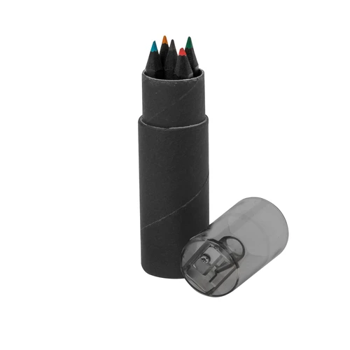 Set de 6 lápices de madera acabada en color negro, con cuerpo hexagonal y minas en varios colores. Presentados en estuche cilíndrico de cartón reciclado negro, con capucha transparente a juego y sacapuntas integrado.