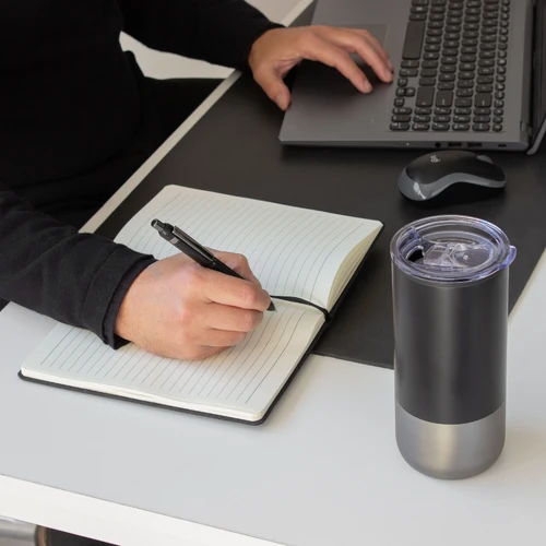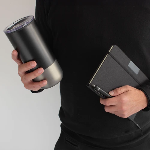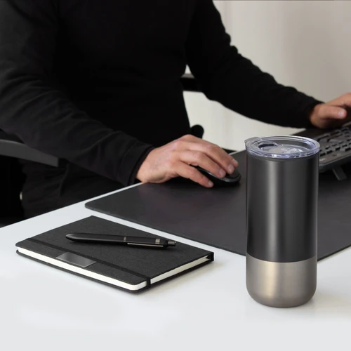 - 1 mug color negro combinado con gris gun en su base, de 8 x 17,6 cm. y 450 ml. Doble pared. Interior en polipropileno, exterior en acero inoxidable 201. Tapa plástica a presión con anillo de silicona.