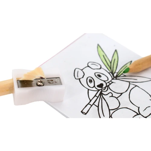 Set de 8 piezas en caja de cartón de acabado natural con ventana. Incluye bloc con dibujos para colorear, sacapuntas y 6 lápices de madera con cuerpo cilíndrico y minas en variados colores.