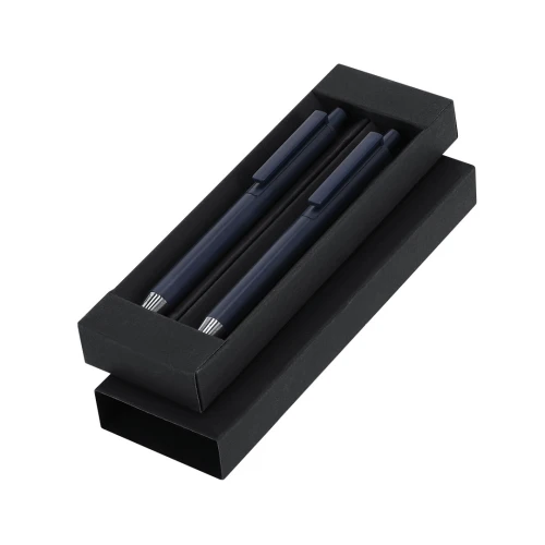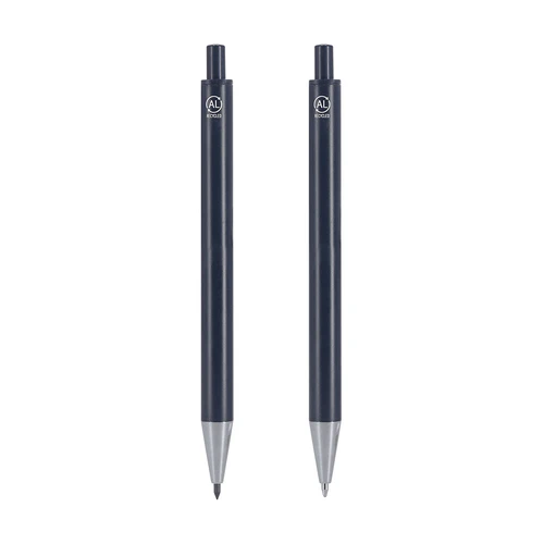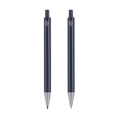 Set compuesto por un bolígrafo de tinta azul y un lápiz eterno, fabricados en Aluminio Reciclado. El lápiz eterno ofrece escritura continua, evitando generar residuos. Ambos cuentan con mecanismo pulsador. Diseñados con clip a juego y detalles cromados. Presentados en estuche de cartón reciclado de color negro. Con distintivo de AL Recycled impreso.