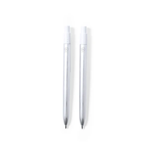 Set eco-friendly de bolígrafo y roller, fabricados en aluminio reciclado y con detalles en ABS reciclado (RABS). Incluye: Bolígrafo en aluminio reciclado de mecanismo pulsador, con cuerpo en color plateado y accesorios en blanco. Con distintivo aluminio reciclado en la parte superior del bolígrafo, cartucho jumbo y tinta azul. Roller en aluminio reciclado de mecanismo pulsador, con cuerpo en color plateado y accesorios en blanco. Con distintivo aluminio reciclado en la parte superior del roller, cartucho jumbo y tinta azul.Set presentado en estuche individual de diseño kraft con funda a juego.El origen del aluminio reciclado se encuentra en la reutilización casi infinita de uno de los materiales con mayor potencial de reciclabilidad sin perder sus propiedades. Esta característica lo convierte en un material eco-friendly de origen reciclado, fácilmente reciclable y de cuyos procesos de tratamiento y desechos para la obtención del material se pueden obtener nuevos recursos reutilizables, consumiendo menos energía en su fabricación, entre otros factores de sostenibilidad.Certificación GRS (Global Recycled Standard / Estándar de Reciclaje Global), que garantiza el origen reciclado del material usado para fabricar el producto.