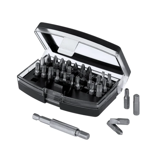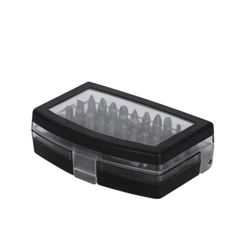 Práctico set de herramientas con estuche fabricado en ABS. Incluye un adaptador de precisión con 32 accesorios magnéticos, compuesto por diversas puntas: philips, estrella, planas, hexagonales y torx.