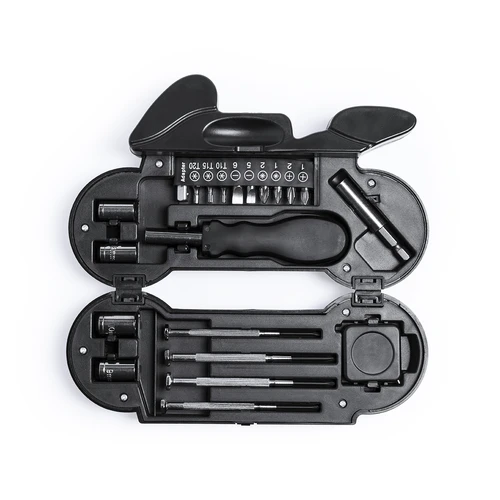 Set de herramientas de 14 accesorios en resistente estuche con diseño de moto, con linterna de 4 ledes integrada. Incluye set de destornilladores de precisión, herramienta de fijación, cabezales destornilladores planos y de estrella y llaves para tuercas de cabeza hexagonal. Pilas de botón incluidas. Presentado en caja individual.