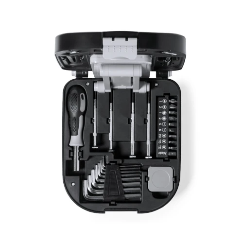 Original set de herramientas con luz y 30 accesorios. Presentado en resistente caja de ABS negra con cierre. Lámpara plegable integrada la caja, con 24 LEDs y botón ON/OFF. Incluye destornillador con multitud de puntas planas, philips, torx… Con kit de destornilladores de precisión llaves de tubo y llaves allen en distintas medidas cutter y flexómetro 1m. Lampará con alimentación a pilas (3xAA no incluidas). Presentado en caja individual de diseño kraft.