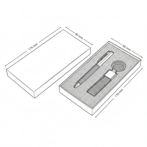 KALANI combina funcionalidad y diseño en un set compuesto por bolígrafo metálico y llavero revestidos en tela RPET gris. Cada elemento está cuidadosamente empacado en una caja negra que proyecta sobriedad y profesionalismo. El RPET proviene de botellas recicladas, dándole una segunda vida al plástico y reforzando el mensaje de cambio desde lo cotidiano. Coloca tu logo y convierte este set en una expresión tangible del compromiso de tu marca con un futuro responsable.