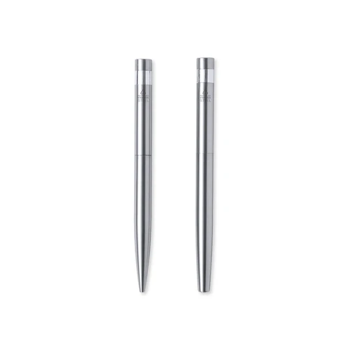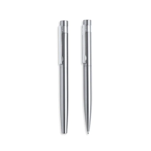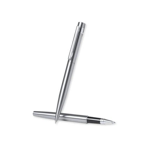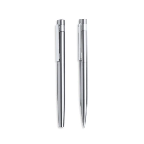 Set eco-friendly de bolígrafo y roller, fabricados en acero inox reciclado. Incluye: Bolígrafo de mecanismo giratorio, con cuerpo en acabado plateado y accesorios en cromado. Clip metálico y distintivo acero inox reciclado en la parte superior del bolígrafo. Cartucho jumbo y tinta azul.Roller con cuerpo en color plateado y accesorios en cromado. Clip metálico y distintivo acero inox reciclado en la parte superior de la capucha. Cartucho jumbo y tinta azul.Set presentado en estuche individual de diseño kraft con funda a juego.El acero es uno de los materiales más demandados y que puede encontrarse casi en todas partes, desde productos de uso diario a grandes construcciones. Con innumerables propiedades, entre las que cabe destacar la durabilidad y su alto grado de reutilización, convirtiéndolo en una alternativa muy valorada en soluciones de sostenibilidad. Debidamente tratado, permite obtener nuevos recursos de infinita utilización.