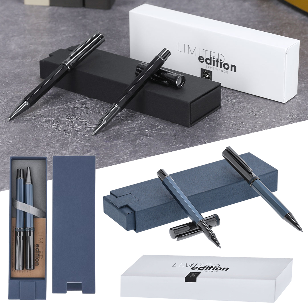 Exclusivo set de bolígrafo y roller de la más alta gama colección Limited Edition. Un complemento moderno, funcional de gran belleza que sobrepasa todas las expectativas. Caracterizado por su elegante y minimalista diseño, así como su calidad premium en resistente y duradero acero inox, en perfecta sintonía con el aluminio. Bolígrafo con sofisticado sistema de apertura giratoria y roller con práctica apertura de capucha. Empuñaduras de diseño hexagonal en colores metalizados mate y parte superior cilíndrica de sofisticado color antracita brillo con clip metálico, de tinta azul y recargables, carga jumbo para roller. De la perfecta combinación entre exclusividad y diseño, nace Limited Edition, una colección especial de ideas promocionales de edidición limitada. Un nuevo concepto, inspirado en la fusión de artículos premium con las últimas y más novedosas tendencias y que cuenta con una seleción limitada de unidades, convirtiendo así un regalo en una experiencia única e inolvidable.Exclusivo estuche de presentación Limited Edition, con diseño protegido por derechos de propiedad industrial.Incluida tarjeta con descripción de Limited Edition en Cartón Reciclado. Bolígrafo y Roller