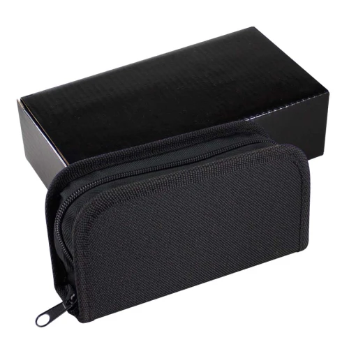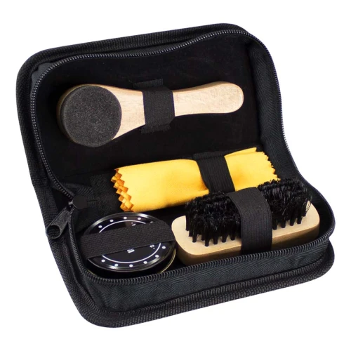 Set de Limpieza de Calzado en Estuche de tela negra. Incluye pasta de zapato color neutro, paño amarillo, esponja y escobilla. Presentación en elegante Estuche barnizado negro.