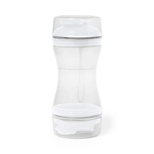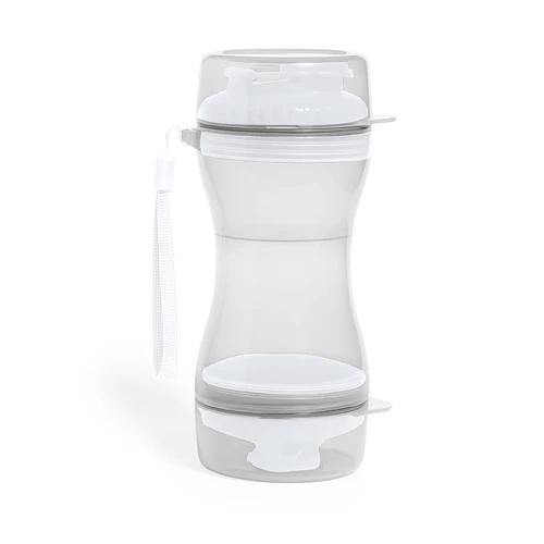 Práctico set de mascotas fabricado en resistente ABS. Con dos compartimentos separados de 330 ml y 280 ml, con tapón de rosca para mayor seguridad y dosificadores incluidos. Además, cuenta con dos tapaderas para usar como cuenco. Presentado individualmente en caja de diseño kraft.