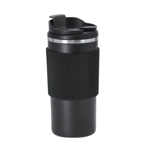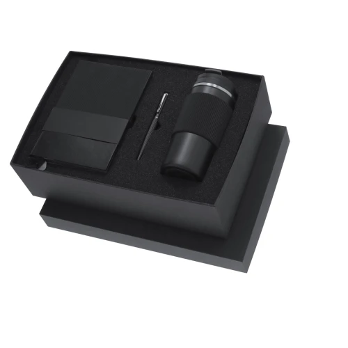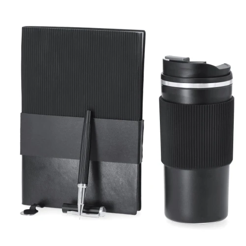 Elegante set premium. Incluye: - Vaso térmico fabricado en acero inoxidable de doble pared con capacidad de 470 ml. Con un dosificador en tapadera, libre de BPA, sistema de apertura abre fácil, banda de silicona a juego y base antideslizante. - Bloc de notas con tapas blandas fabricado en elegante PU color negro. Su diseño combina texturas lisas y biseladas. Incluye marcapáginas de tela con accesorio metálico especial para marcaje en láser. Interior con 100 hojas en color crema, de disposición a una raya y bordes en negro. - Roller de acabado negro mate con detalles metálicos en color plata. De cuerpo biselado, con cierre de capucha, clip y tinta azul. Cuenta con cómodo agarre en metal pulido.Presentado en sosfisticado estuche individual de acabado mate, con interior troquelado para cada uno de los elementos del set.
