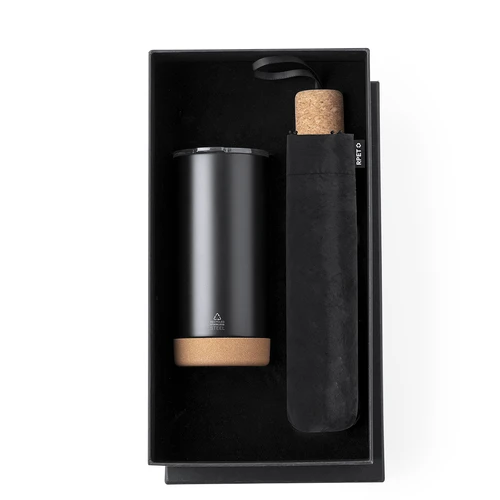 Elegante set premium que incluye: Vaso térmico de doble pared en Acero Inox Reciclado y 550 ml de capacidad, con elegante acabado negro mate. Base de corcho, con tapadera a presión y dosificador. Es ideal para tener en tu escritorio, mesa o en cualquier superficie donde disfrutar tranquilamente de tu bebida favorita. Paraguas plegable de color negro con 98cm de diámetro. En material pongee 190T RPET y mango de corcho. De apertura manual, con sistema anti viento y varillas en fibra de vidrio. Con etiqueta distintiva RPET. Set presentado en estuche individual de acabado mate, con troquelado interior para cada uno de los elementos del set. El material RPET se elabora a partir de plástico reciclado, para así fomentar la reutilización de residuos plásticos y ayudar a la sostenibilidad del planeta.