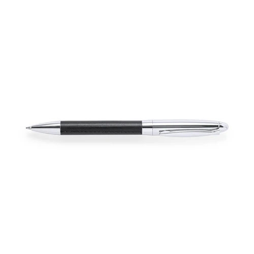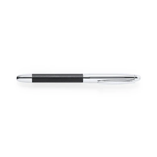 Set premium de bolígrafo y roller. Fabricado en elegante combinación de polipiel en tonos negros y metal cromado. Bolígrafo de mecanismo giratorio en tinta azul y con cartucho jumbo. Roller con capucha y tinta gel en azul, carga jumbo. Presentado en estuche individual de polipiel con cierre de cremallera e interior a juego con compartimentos individuales.