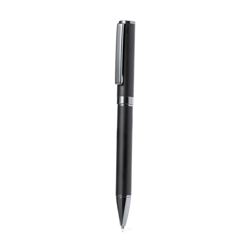 Elegante set de bolígrafo y roller. Bolígrafo de mecanismo giratorio y roller con capucha, ambos provistos de un clip metálico. Con tinta azul, su cuerpo presenta un elegante acabado negro mate y sutiles detalles cromados. Presentados en un estuche kraft negro, con interior troquelado en tacto de terciopelo.