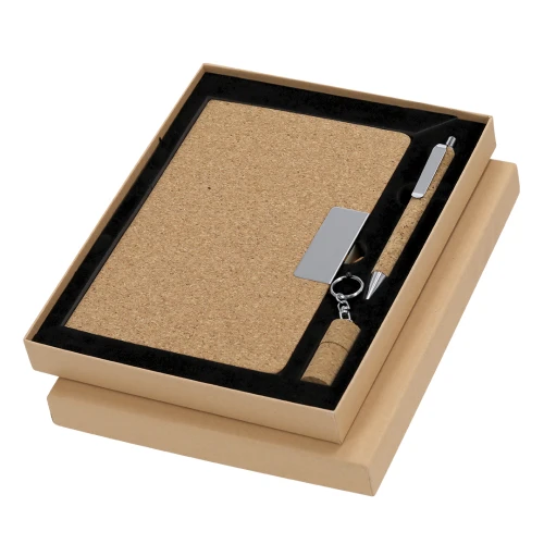 Set de bloc de notas y bolígrafo elaborado en corcho. Incluye:Bloc de notas de tapas rígidas, con detalle metálico en la portada, marcapáginas de tela y elástico de sujeción a juego. 80 hojas interiores con disposición a una raya. Bolígrafo con cuerpo recubierto en suave corcho. Elegante clip metálico y accesorios a juego, de mecanismo pulsador y en tinta azul. Llavero memoria USB de 16GB en forma de corcho de botella. Set presentado en elegante estuche de diseño en color kraft, con compartimento independiente para cada artículo.Elaborado con elementos vegetales para así fomentar la utilización de materias primas naturales y reducir las emisiones contaminantes.