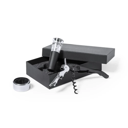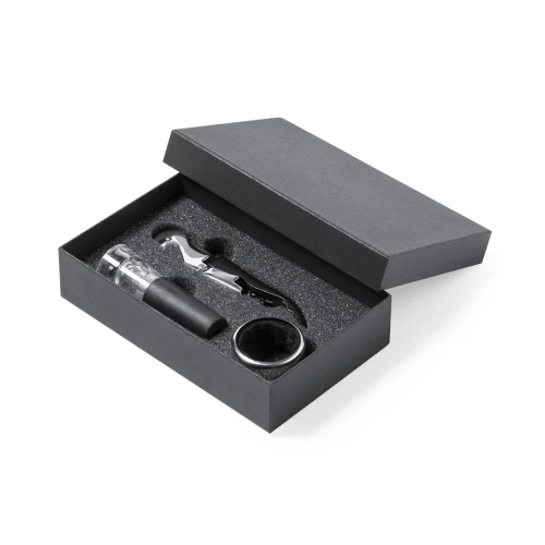 Completo set de vinos de sobrio acabado negro, presentado en estuche individual con interior troquelado de espuma y funda de protección en blanco. Incluye recogegotas, sacacorchos en acero inox y tapón bomba de vacío.