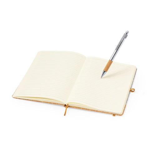 Set de bloc de notas y bolígrafo confeccionados en fieltro RPET y Aluminio Reciclado. Incluye un bloc de notas de tapas rígidas, elaboradas en fieltro RPET y corcho natural, con 80 páginas lisas, banda elástica, marcapáginas y un elástico para sujetar bolígrafos de color marrón. Además, cuenta con un bolígrafo de Aluminio Reciclado con empuñadura de corcho natural, mecanismo pulsador y tinta azul. Se presenta de manera elegante en una caja de presentación.El fieltro RPET es fruto de la combinación del proceso de reciclaje de materiales plásticos junto con la técnica milenaria de fabricación del fieltro, dando como resultado un material de eco-tendencia que, además de ser de origen reciclado, también se convierte en reciclable.
