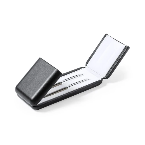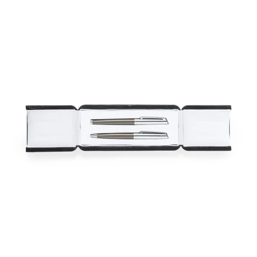 Set premium de bolígrafo y roller. Fabricado en elegante combinación de metal en tonos negros y cromados. Bolígrafo de mecanismo giratorio en tinta azul y con cartucho jumbo. Roller con capucha y tinta gel en azul, carga jumbo. Presentado en estuche individual de polipiel con interior en contraste de antelina en blanco.