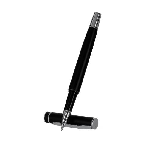 Set de bolígrafo y roller fabricados en Aluminio Reciclado, en elegante diseño negro mate con distinguidos accesorios en acabado plateado. Bolígrafo de mecanismo pulsador y roller con capucha, ambos con clip metálico. En tinta azul y logotipo de Aluminio Reciclado. Presentación en elegante estuche negro.