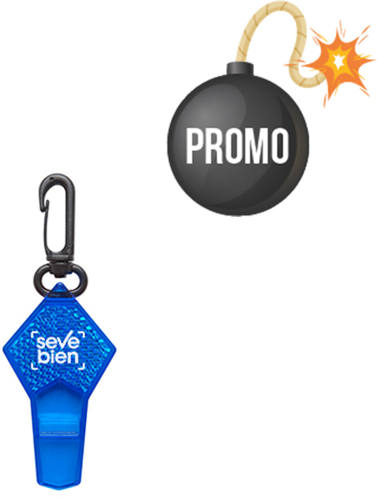 7,5 x 4 cm. Material reflectante. Silbato transparente con formato romboide. Mosquetón color negro.