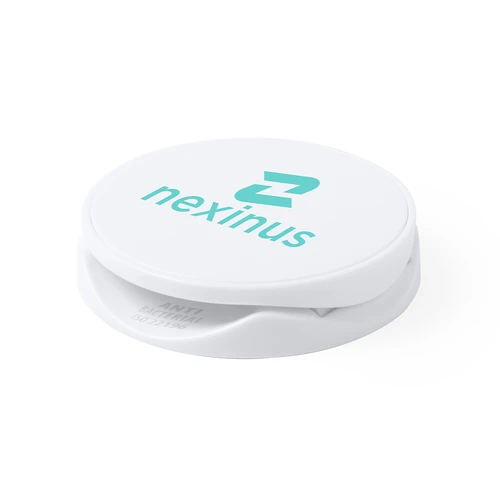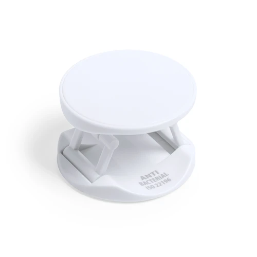Soporte antibacteriano para smartphone. Diseño plegable en elegante acabado de color blanco, especialmente diseñado para marcaje en tampografía. Con adhesivo 3M, de fijación extra fuerte y libre de residuos al despegarlo del dispositivo.Los productos con tratamientos antibacterianos son capaces de reducir drásticamente las cargas bacterianas presentes en las superficies de los materiales, gracias a la incorporación de agentes microbianos permanentes estáticos, con alta efectividad para inhibir y prevenir la contaminación bacteriana.Artículo de acuerdo al estándar ISO 22196, que determina la actividad antibacteriana en materiales plásticos y superficies no porosas, lo que permite conocer la efectividad de inhibición microbiana que tienen los aditivos sobre los objetos tratados mediante una evaluación cuantitativa.