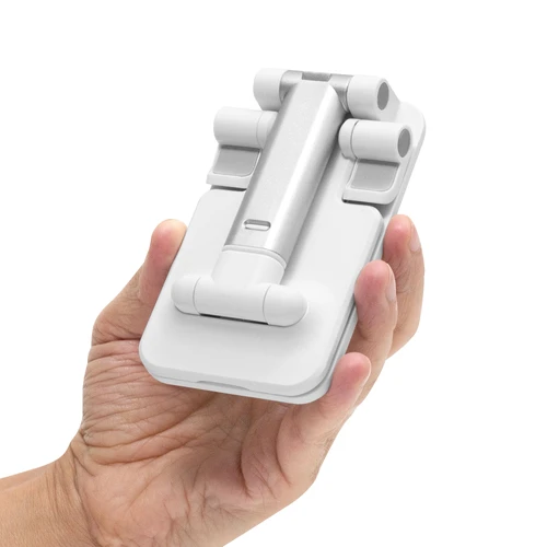 Tu celular, a tu altura.Soporte plegable para móvil. Tiene un sistema extensible de ajuste de altura e inclinación para posicionar el celular. Base con apliques de silicona antideslizantes.Medidas: 11,6 x 8 x 12 cm.
