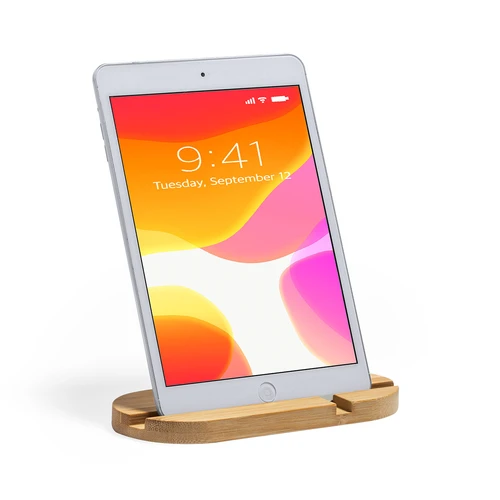 Original y sencillo soporte de línea nature para smartphone y tablet. Fabricado en bambú procedente de cortes naturales. Presentado en atractiva caja individual de diseño eco.