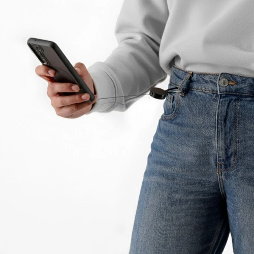 Soporte extensible de 60 cm para smartphone. Accesorio de transporte para situar entre la funda y el smartphone y mosquetón giratorio metálico. Incluye un mosquetón en el extremo para colgar y poder transportar con facilidad.
