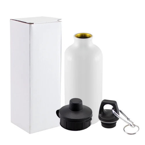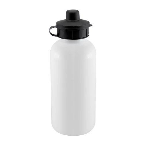 Sport Bottle (Botella deportiva) de 550cc. con cuerpo blanco para Sublimación. Contiene 2 tapas negras para diferentes usos. Presentación en caja de Cartón Blanco.