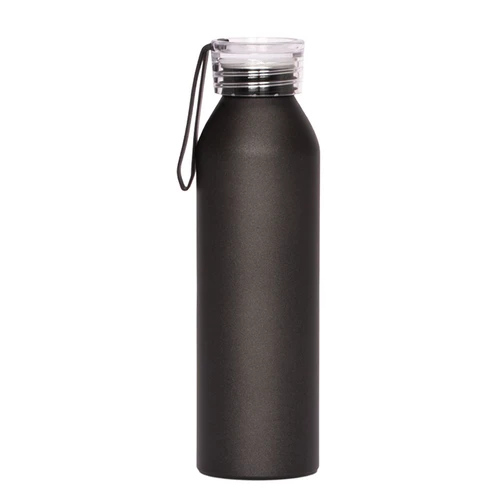 Sport Bottle botella metálica de Aluminio modelo "MARATHON", con tapa rosca de plástico PP translúcido, banda colgante de silicona y anillo interior anti-derrame. Producto BPA FREE, para el contacto con líquidos y alimentos. Capacidad 600ml. Presentación en bolsa plástico burbuja + caja de regalo de cartón lacado color negro. IMPORTANTE: esta botella NO es térmica, apta sólo para líquidos fríos.