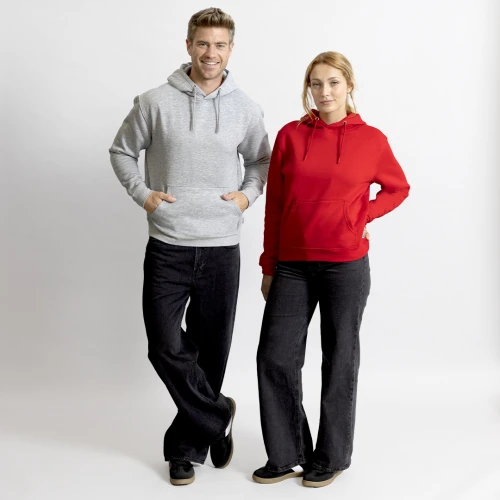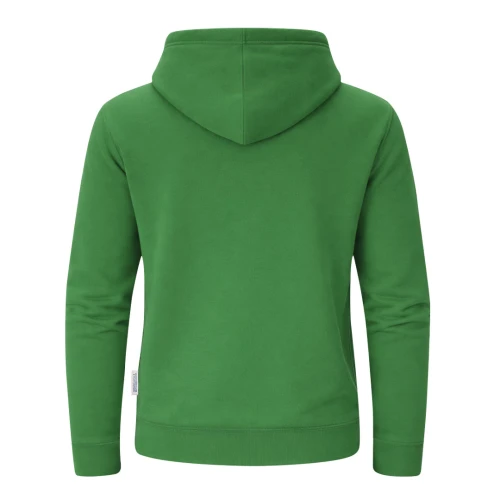 Sudadera con capucha Unisex de Algodón Orgánico y Poliéster Reciclado, en suave felpa perchada de 280 g/m2. Con capucha forrada de doble capa, cordones redondos ajustables -con topes a juego- y ojales metálicos. Puños y cintura de punto canalé de elastano y bolsillo frontal tipo canguro. Cubrecosturas reforzado en cuello, con etiqueta distintiva eco.