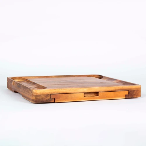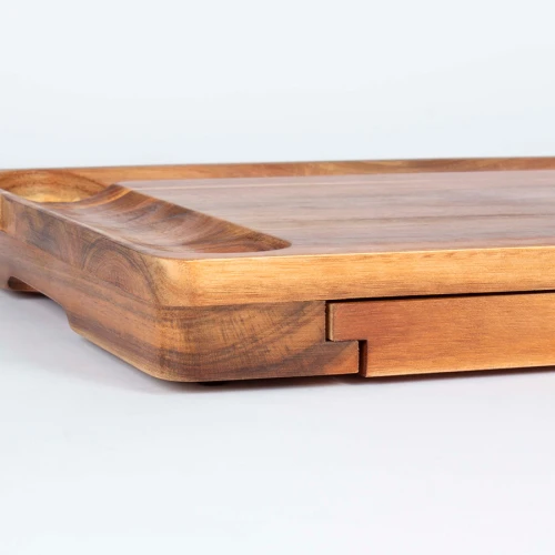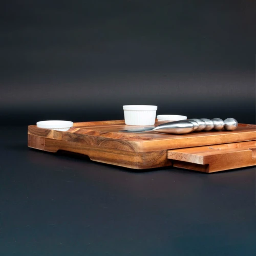 Espectacular tabla de madera sólida de ACACIA, con doble canal para picoteo, gran espacio central para quesos. Contiene 3 posillos de loza blanca para salsas + 6 cuchillos para cortar quesos + 6 tenedores pinchos de queso, de Acero inoxidable , en 2 compartimentos inferiores retráctiles. Madera trabajada y acabada en máquina, de forma 100% regular, con superficies y cantos lisos y suaves, para una mayor higiene y comodidad al momento de cortar y servir los quesos.