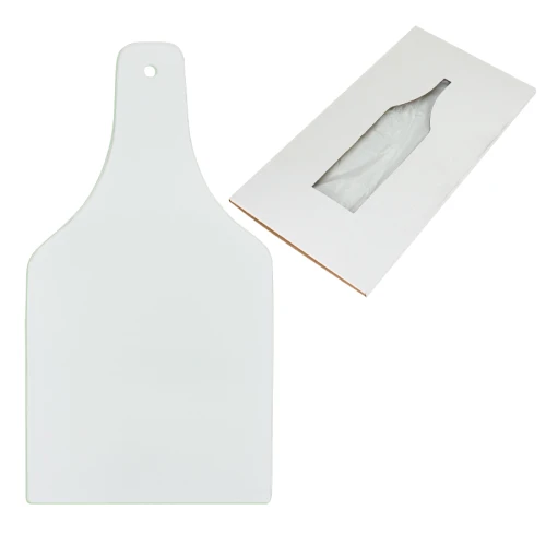Tabla de Cocina para cortar alimentos, forma de botella, en vidrio texturado para Sublimación. Presentación en caja de cartón blanco.