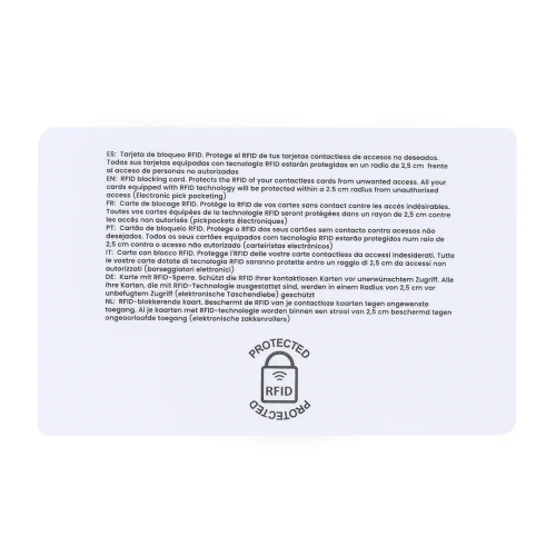 Tarjeta con sistema de protección RFID, diseñada para bloquear accesos no autorizados a tarjetas contactless. Funciona mediante un campo electromagnético que interfiere con las señales de lectura, protegiendo las tarjetas ( bancarias, de crédito, transporte público, etc.) ubicadas en un radio de entre 2 y 3 cm alrededor de la tarjeta.