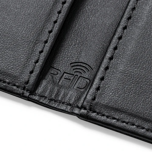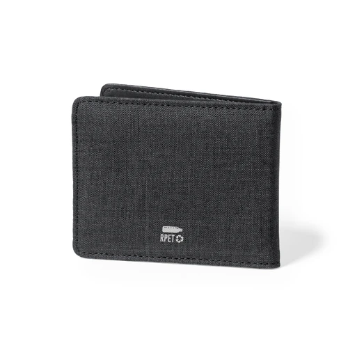 Elegante tarjetero billetero fabricado en poliéster RPET de acabado en color negro. Interior con 6 compartimentos independientes para tarjetas y amplio billetero. Con tecnología de seguridad RFID (Identificación por Radio Frecuencia) que mantiene seguros tus dispositivos de transmisión de identidad. Distintivo RPET en el exterior y RFID en el interior. El material RPET se elabora a partir de plástico reciclado, para así fomentar la reutilización de residuos plásticos y ayudar a la sostenibilidad del planeta.