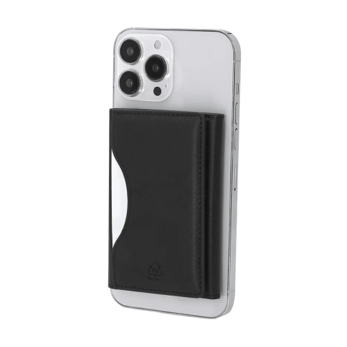 Tarjetero soporte en elegante PU reciclado. Con tarjetero multifuncional que ofrece 6 compartimentos, con cierre plegable magnético. Con sistema de fijación móvil magnético.