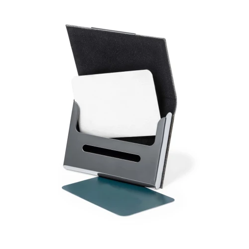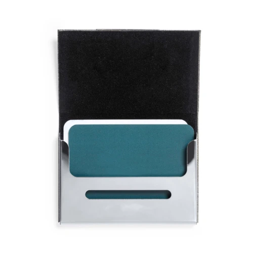 Elegante tarjetero fabricado en resistente poliéster RPET 300D. De tapas duras y cierre magnético. Con detalle metálico cromado en la parte frontal y compartimento interior para almacenar las tarjetas. Con distintivo RPET en la parte trasera y disponible en variada gama de colores. El material RPET se elabora a partir de plástico reciclado, para así fomentar la reutilización de residuos plásticos y ayudar a la sostenibilidad del planeta.
