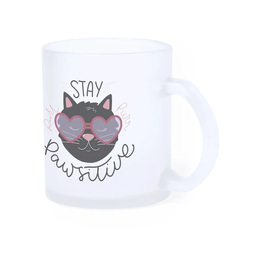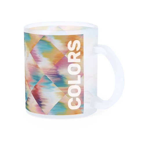 Taza de cristal de 350ml de capacidad, de acabado translúcido y especialmente diseñada para marcaje en sublimación. Presentada en caja individual de diseño kraft.