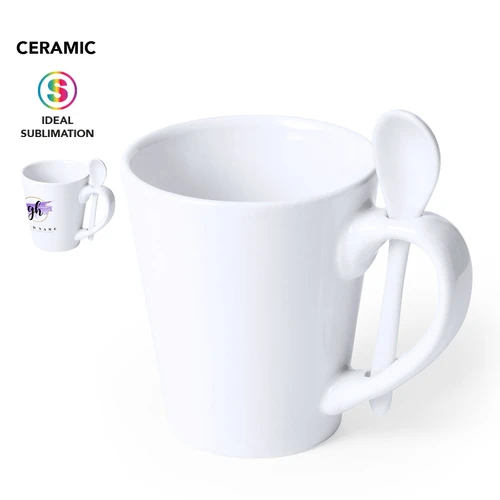 Taza de cerámica de 350ml de capacidad en color blanco y con cucharilla de cerámica integrada en el asa. Especialmente diseñada para marcaje en sublimación. Presentada en caja individual.Disponible manual de instrucciones en español e inglés.