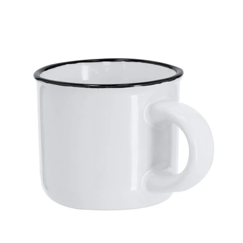 Taza de cerámica de 85ml de capacidad con diseño vintage. En elegante diseño bicolor, con anilla color negra en el borde y cuerpo en color blanco. Especialmente diseñada para marcaje en sublimación.