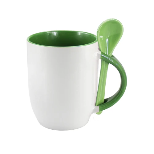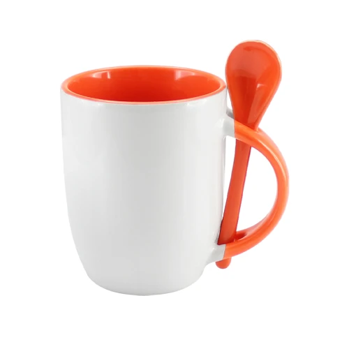 Tazón Cerámico blanco con interior, asa y cuchara de color, cobertura exterior con polímero especial marca ORCA COATINGS(R) para una sublimación de primera calidad. Cada unidad se entrega dentro de su caja individual de cartón blanco.