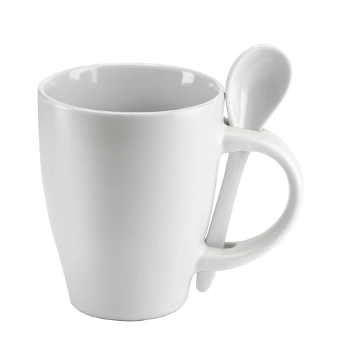 Tazón Cerámico Blanco opaco con interior y cuchara de color. Presentación en caja de cartón blanco.