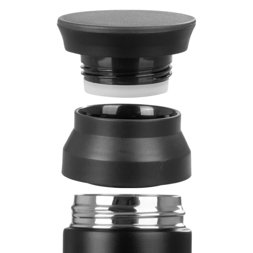 Botella térmica metálica doble pared aislante, cubierta de Polipropileno (PP) acabado mate, interior Acero inoxidable 304 SS, exterior Acero inoxidable 201 SS, modelo "SMART LID". Incluye doble tapa rosca de plástico PP negro, con sello cilíndrico de silicona, sistema de filtro circular y termómetro digital en la tapa superior, que marca la temperatura del líquido interior. Capacidad 480ml. Producto BPA FREE, para el contacto con líquidos y alimentos. Presentación en bolsa plástica transparente + caja de regalo de cartón laminado negro.
