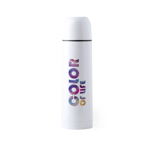 Termo de 500ml de capacidad en resistente acero inox. Superficie exterior especialmente diseñada para marcaje en sublimación. Con tapón de seguridad y presentado en atractiva caja individual de diseño.
