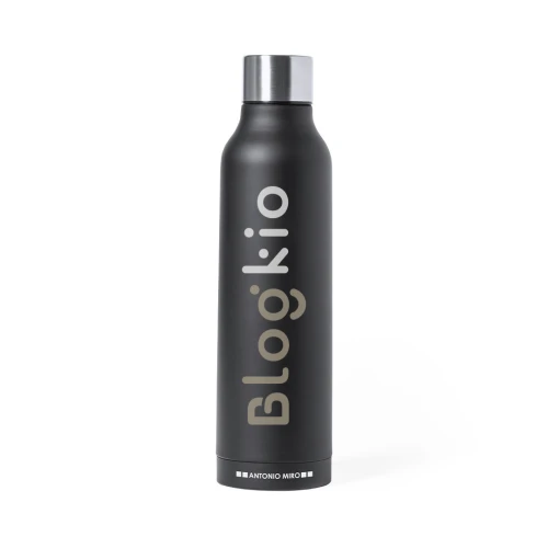 Termo en acero inox de Antonio Miró. De 500ml de capacidad y con doble pared para mejor y más duradera conservación de la temperatura. De sobrio acabado en negro satinado, logotipo de la marca en la base y con tapón cromado a rosca. Presentado en atractiva caja de diseño con logotipo de la marca.