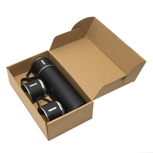 Ø 6,5 cm x 23,5 cm. Acero inoxidable y Polipropileno. Capacidad 500 ml. Set de termo y tres tazas. Termo con doble pared sellado al vacío. Acero inoxidable 304 interior / 201 exterior. Tapa y tazas Ø 6,5 cm x 5 cm. Capacidad 120 ml. Acero inoxidable 304 interior / Polipropileno exterior. Pintura acabado mate. Mantiene por más de 12 hs la temperatura de las bebidas calientes y 24 hs de las bebidas frías. Presentación en caja de regalo Kraft.