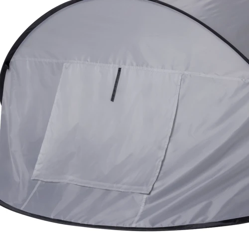 Tienda de campaña automontable, solo hay que sacarla de la funda y se despliega automáticamente. Fabricada en resistente poliéster RPET, con estructura metálica y detalles en color negro. Amplia puerta de entrada, con cierre de cremallera de doble tirador interior y exterior. Ventana en parte posterior con mosquitera, cierre de velcro y cortina enrollable con cordón y cinta de sujeción. Ideal para 2 personas y de fácil plegado. Presentada en funda a juego, con distintivo RPET en etiqueta exterior.El material RPET se elabora a partir de plástico reciclado, para así fomentar la reutilización de residuos plásticos y ayudar a la sostenibilidad del planeta.